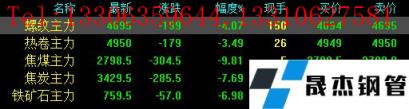 今日螺紋主力期貨跌199,收報4695,跌幅4.07%;熱卷主力跌179,收報4950,跌幅3.49%;焦煤主力跌304.5,收報2798.5,跌幅9.81%;焦炭主力跌285.5,收報3429.5,跌幅7.69%;鐵礦石主力跌57,收報759.5,跌幅6.98%。